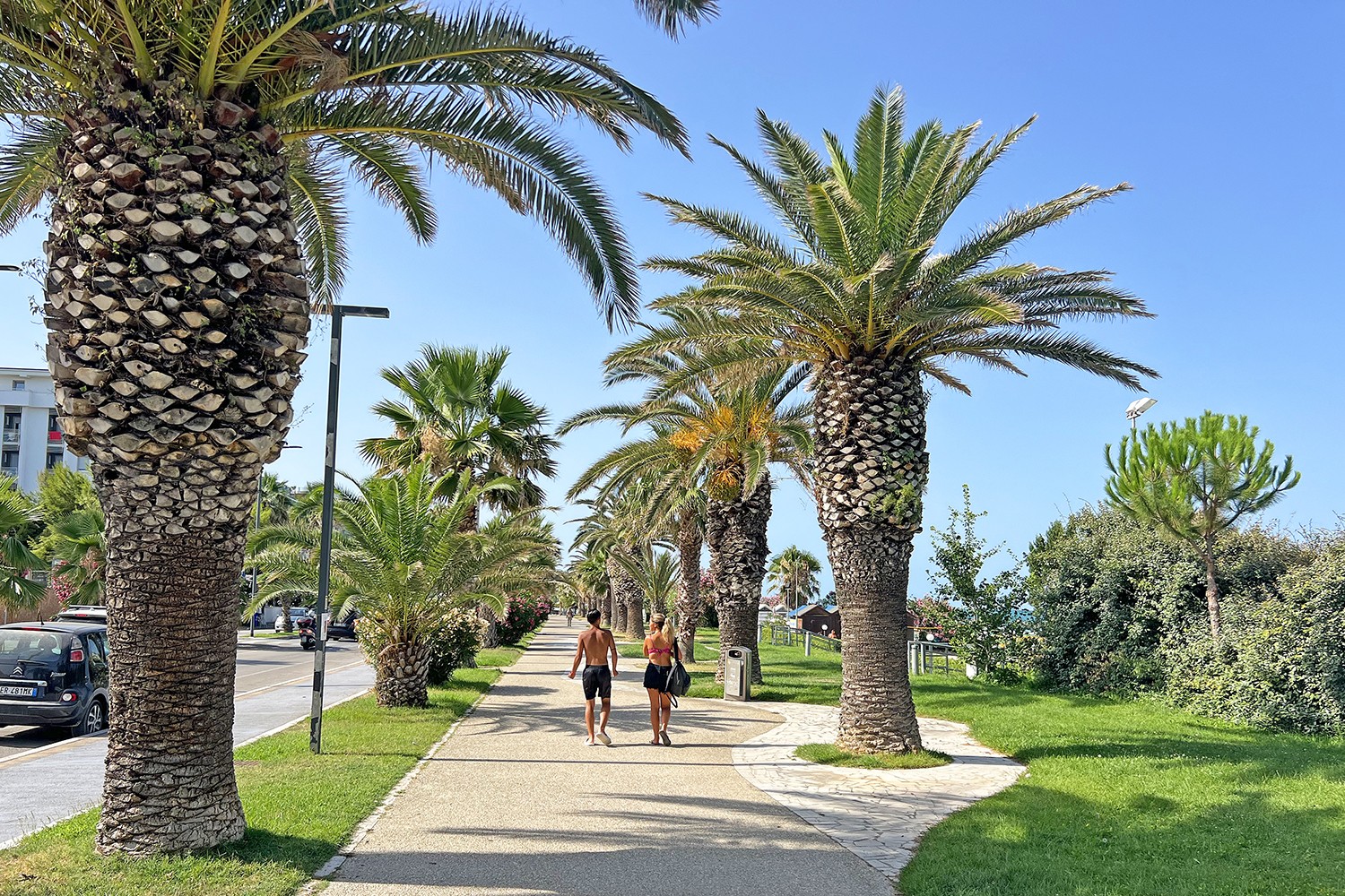 Langs het strand is een lange palmen boulevard waar je heerlijk kunt wandelen en fietsen.
