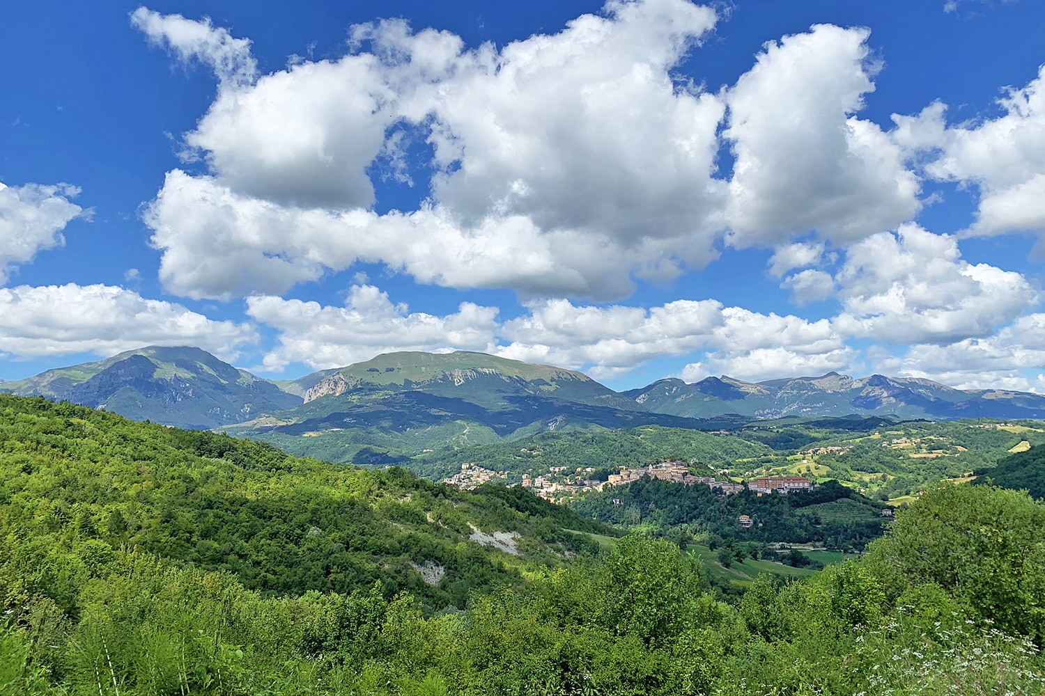 Amandola verscholen tussen de heuvels en bergen.