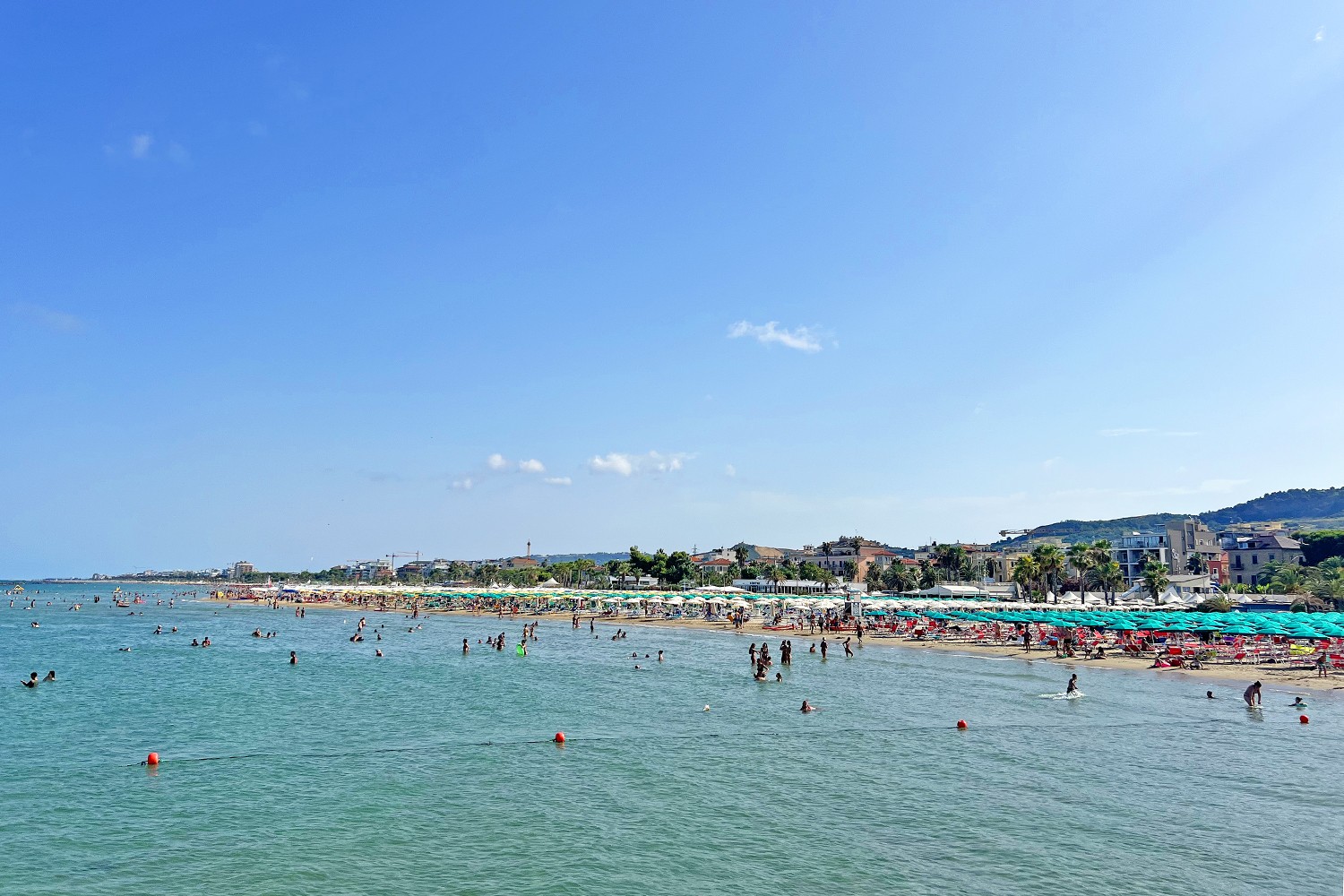 Langs de kust strekt zich een kilometerlange palmenboulevard uit, met tal van chalets, cafés, restaurants en ijssalons. Hier kun je genieten van de heerlijkste visgerechten, gelato en een ontspannen sfeer met uitzicht op zee. Het strand zelf is breed en drukbezocht, en kan daardoor soms wat vol aanvoelen – niet helemaal voor iedereen, maar het draagt bij aan de levendige badplaats-sfeer.