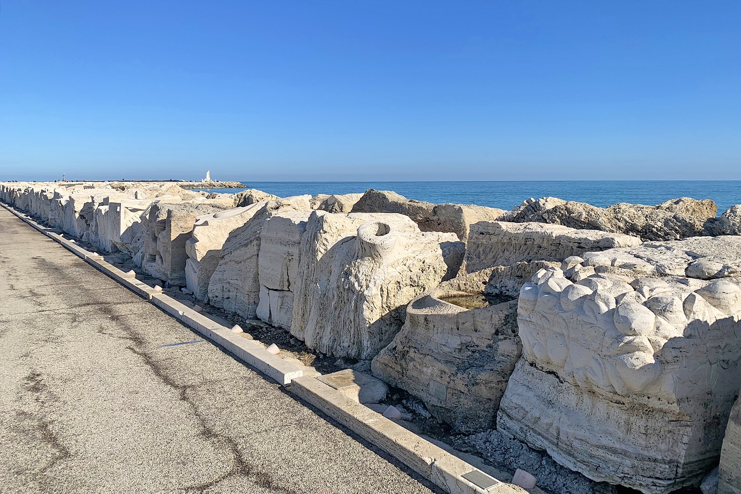 Langs de pier bij de haven vindt je een lange rij met kunstobjecten gemaakt uit de travertin golfbrekers.