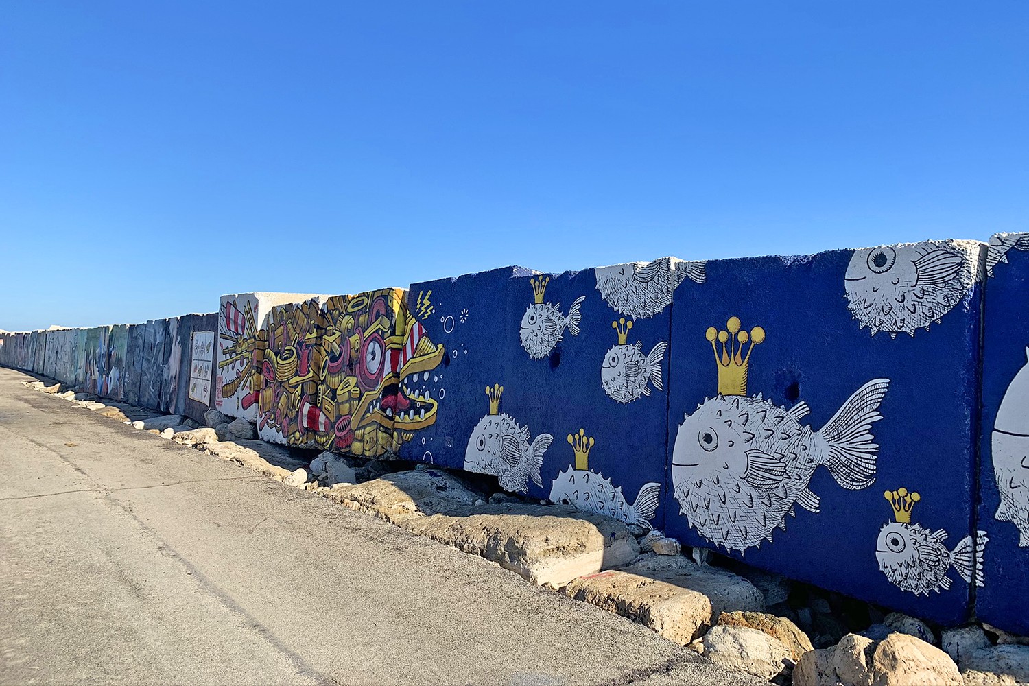 Op de blokken die als golfbrekers dienen zijn afbeeldingen geschilderd die verband hebben met de zee.